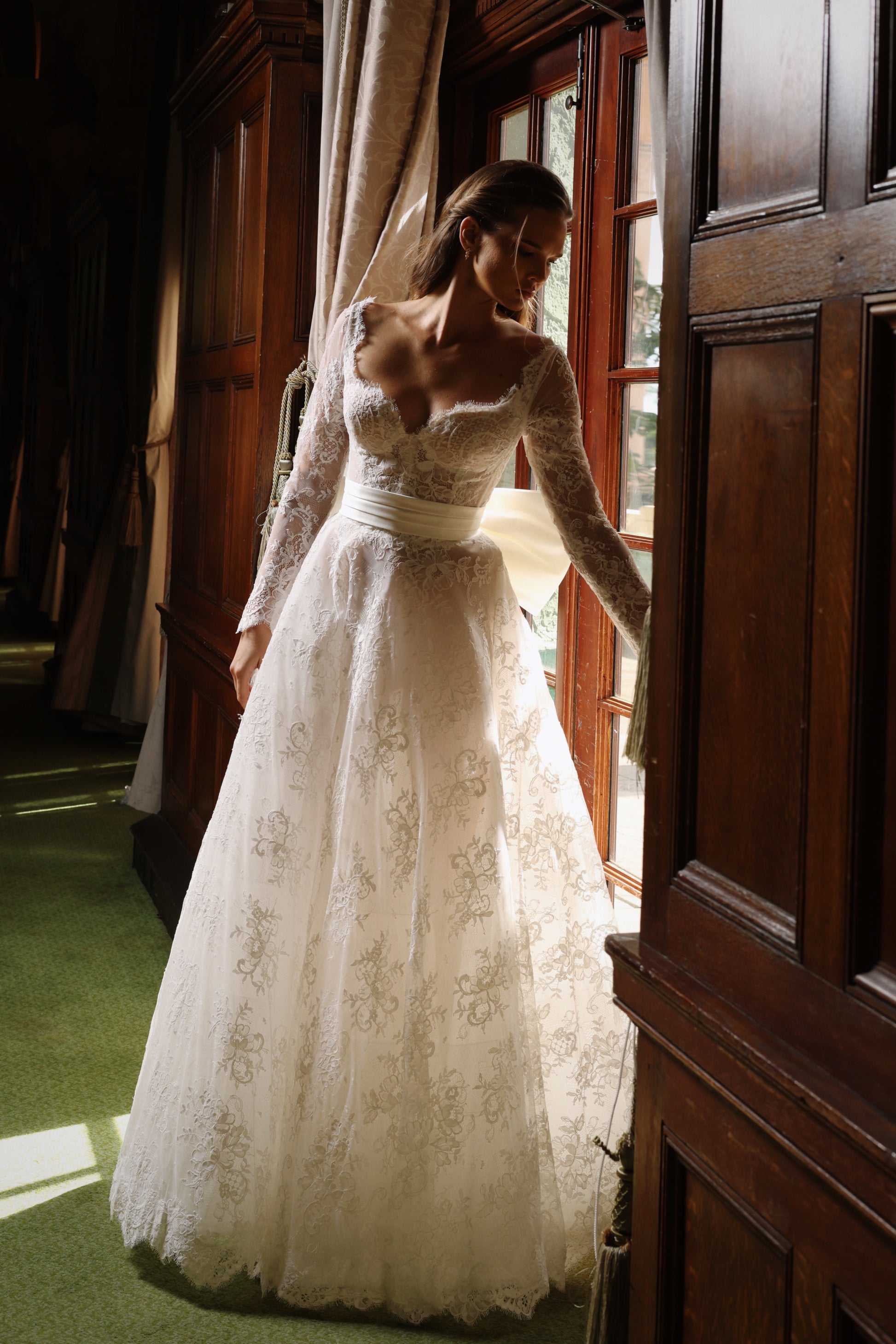 Amorette es ese vestido que no necesita exagerar para enamorar. Su delicado encaje floral abraza el cuerpo con suavidad, mientras la falda amplia cae con una gracia natural que acompaña cada paso. Las mangas largas aportan un aire romántico y atemporal, perfecto para la novia que sueña con un momento íntimo, elegante y lleno de luz.