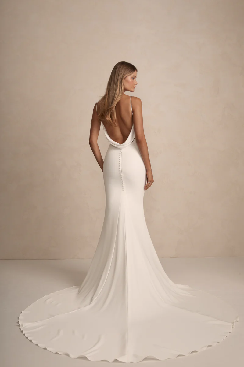 Archie es una combinación sexy y sofisticada de lo moderno y lo clásico. Su diseño, que se ajusta a la figura y se realiza con un suave crepe francés doble sin costuras, está creado para resaltar por completo cada curva y giro del cuerpo, mientras que su característica espalda con vuelo lo cubre de manera espectacular.
