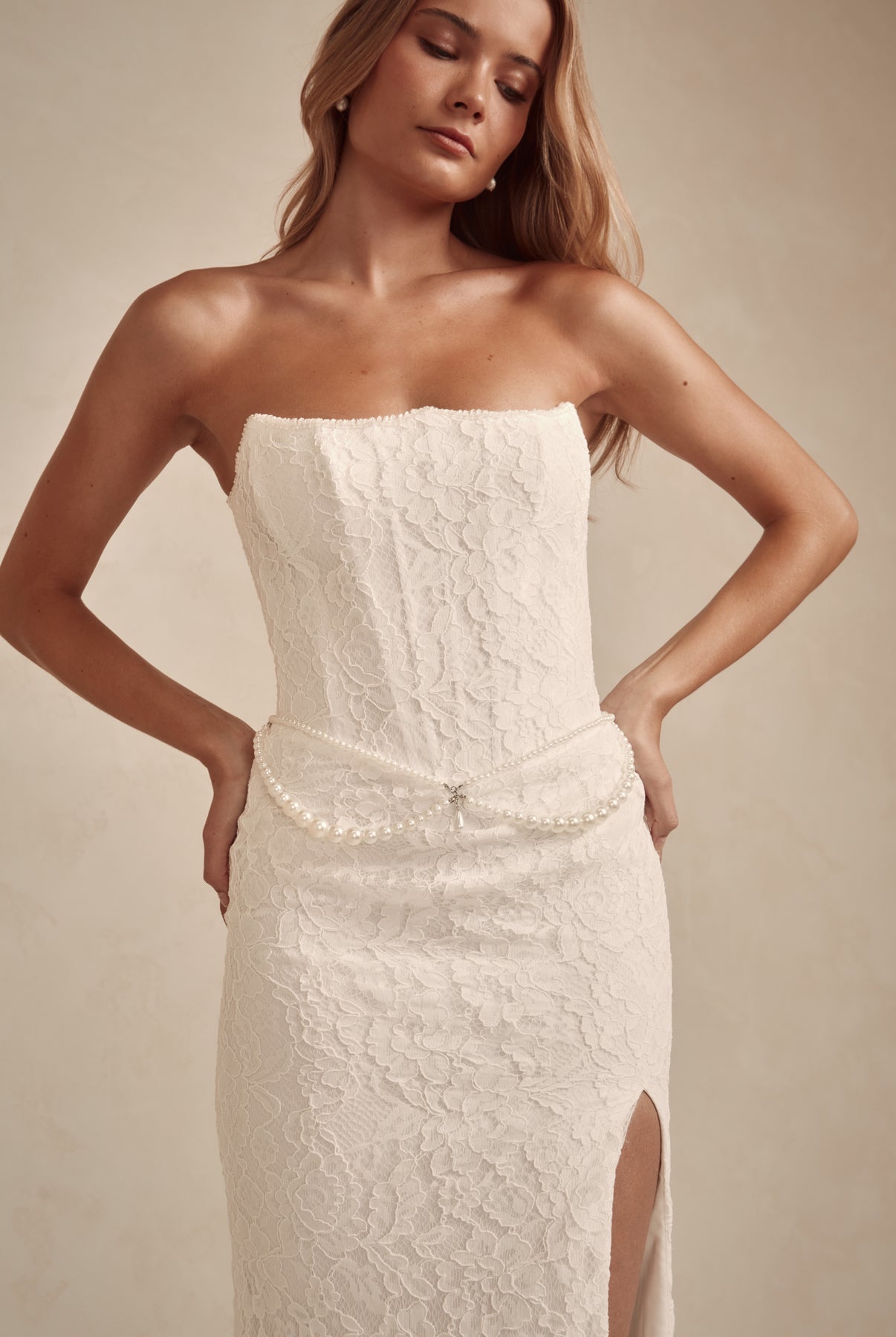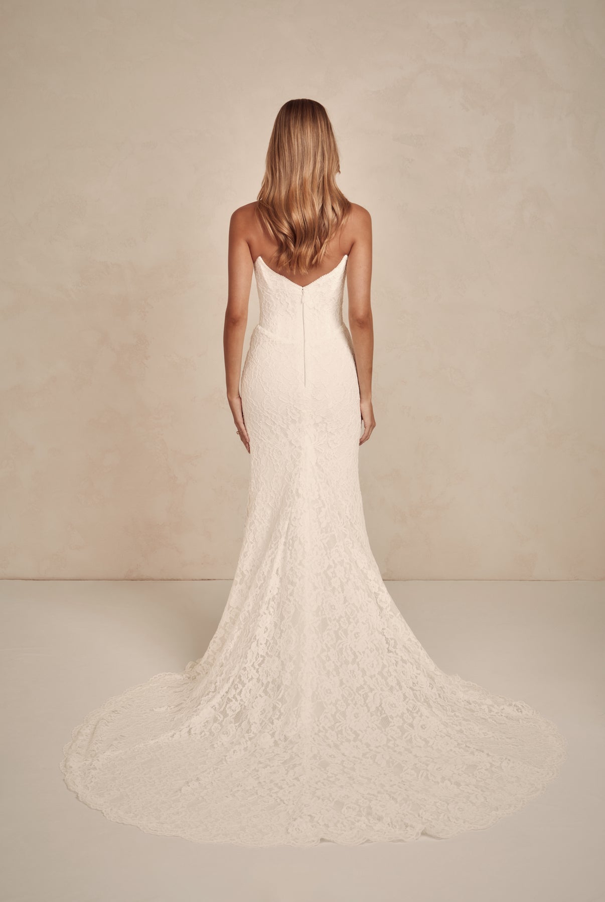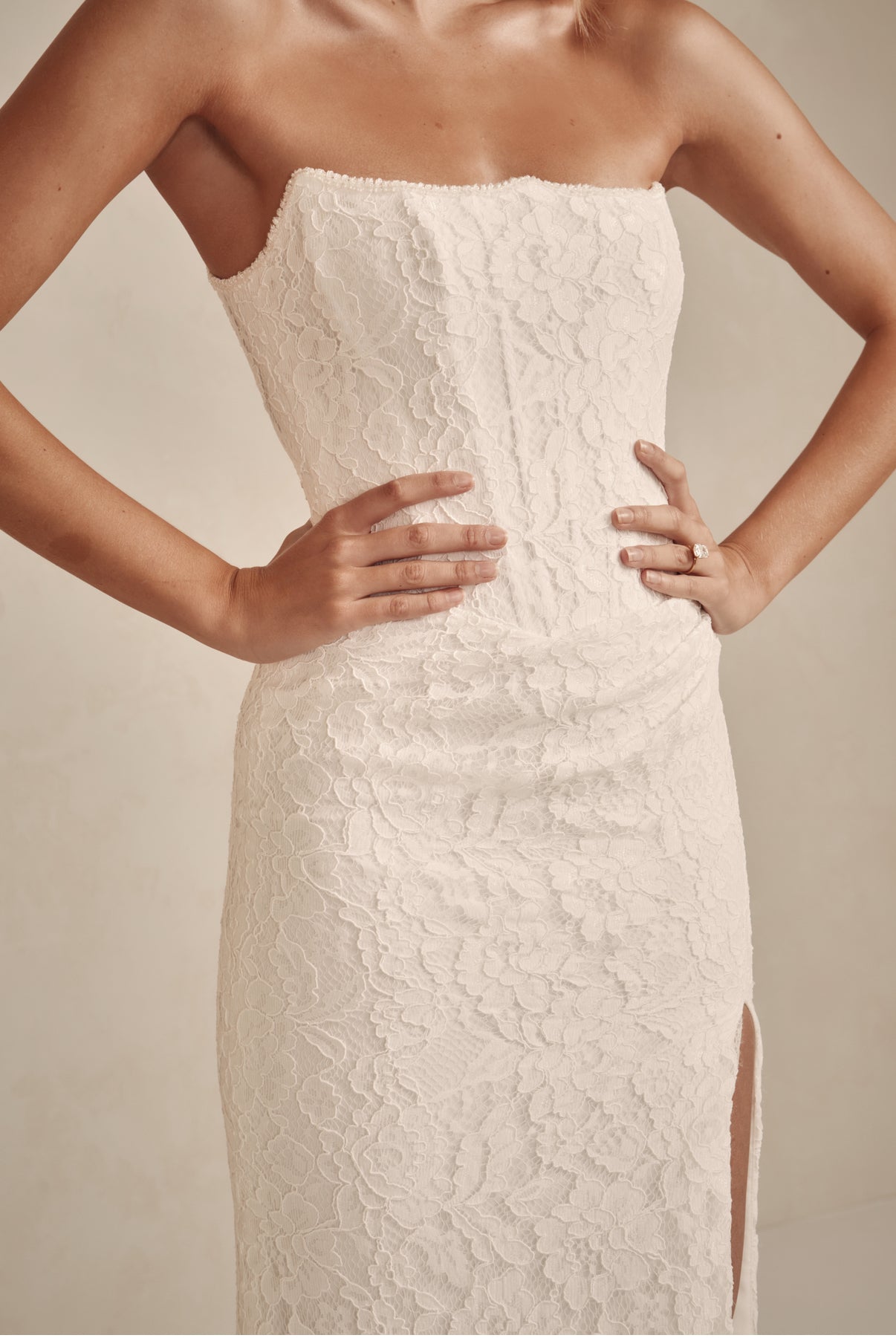 Frankie reinventado para la novia moderna. Confeccionado con un hermoso encaje, esta silueta presenta un único top de tres picos, rediseñado para un ajuste más esculpido y refinado. El escote palabra de honor favorece con facilidad, pídelo con una abertura hasta el muslo que aporta movimiento y un toque contemporáneo a su estilo atemporal.