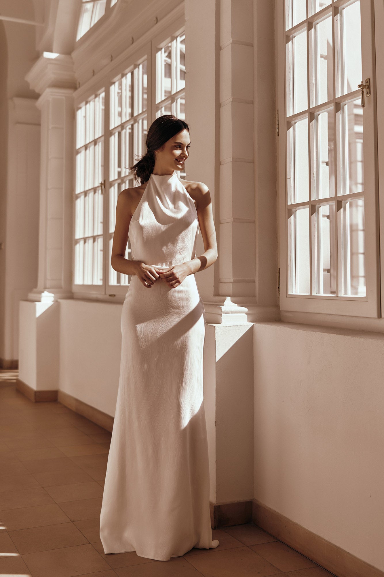 Un vestido liso, con espalda descubierta, escote halter y cuello vuelto. La tela de delicada textura acentúa la sensualidad de este diseño increíblemente femenino.